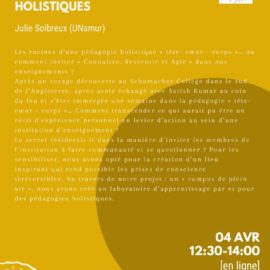 Campus en plein air, à l’épreuve de nos pédagogies holistiques Julie Solbreux (UNamur) Le 4 avril 2024 de 12h30 à 14h00 en ligne. Pour rejoindre la réunion TEAMS de l’événement, cliquez ici.